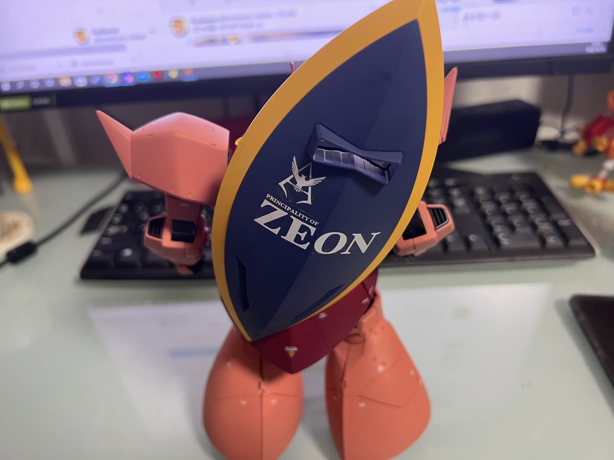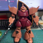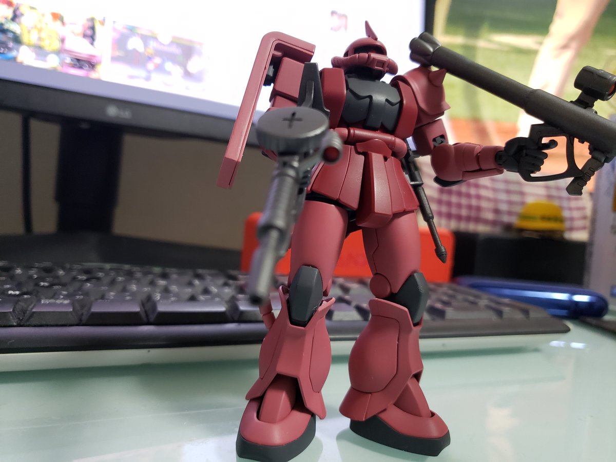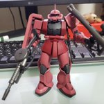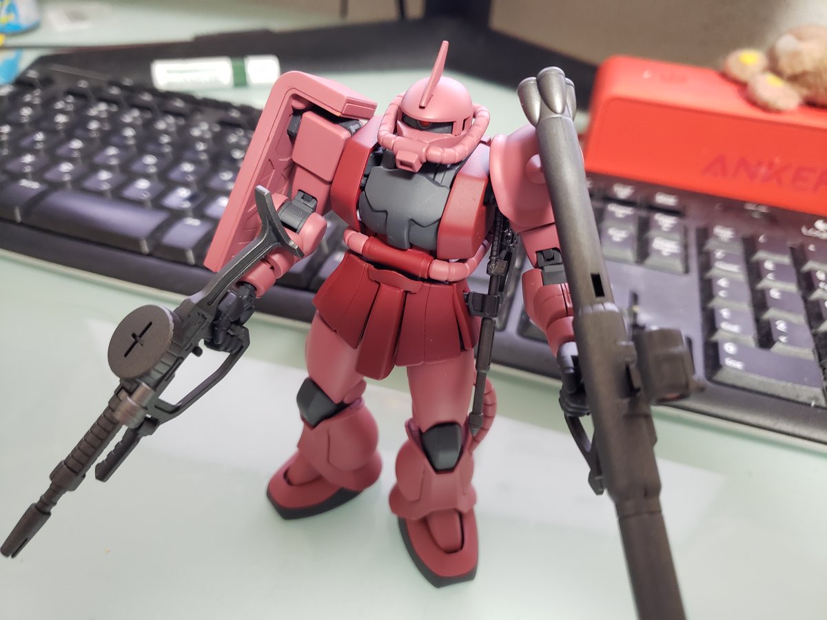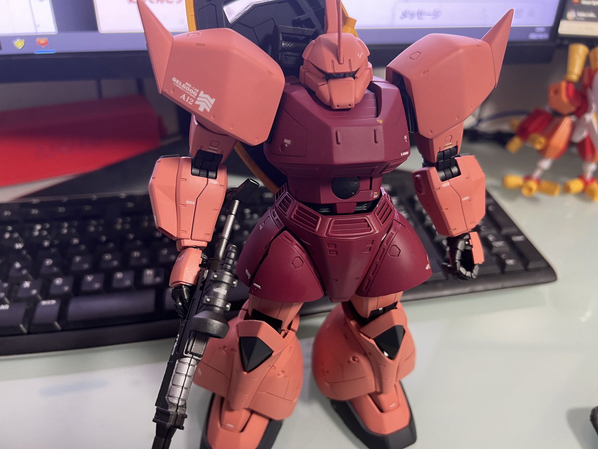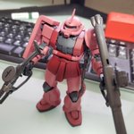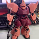 シャアザクです。お納めください。塗装はガイアノーツのローズピンクと、ローズディープレッド、メカサフスーパーヘビィ、スターブライトアイアンです。連れが作りました。#ガンプラ好きと繋がりたい #ガンプラの画像貼るとRTされると聞いて