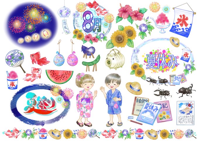 8月のイラストセット、カラーの方も出来上がりました。次回9月も8月頭には仕上げます! これからイラストACにアップします。 夏が長いので早く秋モノ描きたい気分です(o´罒`o) NFTはこちら♡Adam by GMO adam.jp/stores/kunshit… #イラスト #デジタルアート #イラスト好きな方と繋がりたい