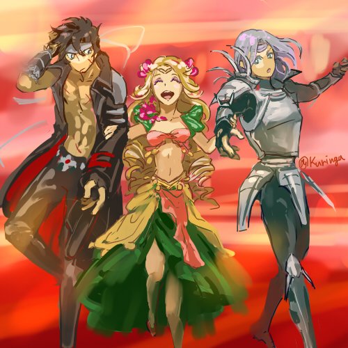 トウジ君、マーメイドの踊り子さん、ジェイムズ君です。 踊り子の中の人は人魚だったりネレイドに似ていたり、テティスその人だったりして神秘に満ちていますね #サガシリーズ版深夜のお絵描き一本勝負