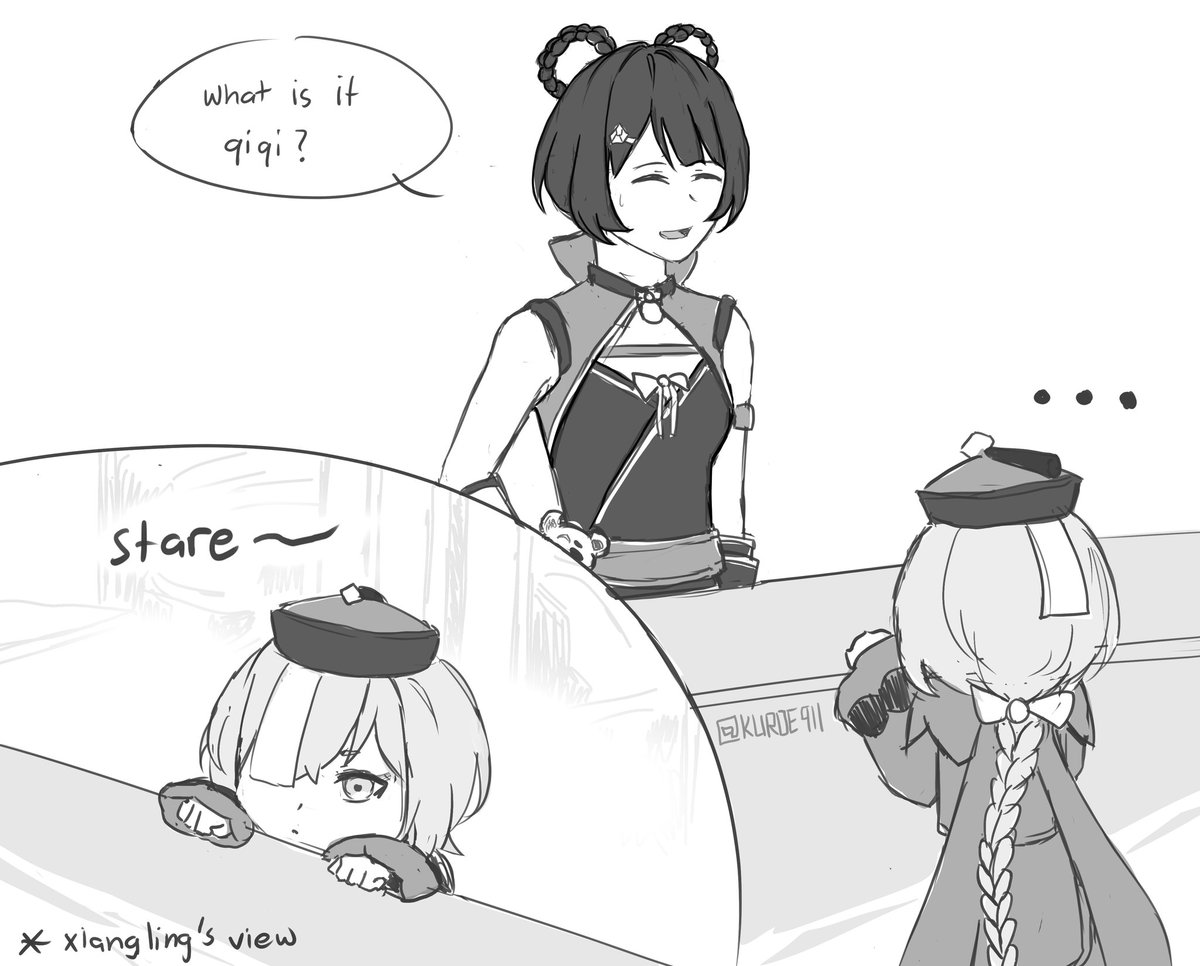 Xiangling waiting for a response from the receptionist if she could live in Qiqi's serenitea pot :) . . #qiqi #xiangling #GenshinImpact #genshinimpactfanart #sereniteapot