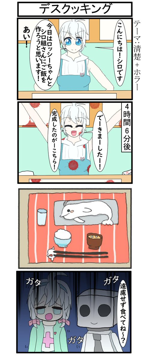 #SiroArt #Siro4koma シロちゃんが描いたイラスト全て使いました(ご満悦)。 テーマが清楚かホラーかの二択しか選べなかったので内容を考えるのが少し難しかったです。 またやりたいよシロちゃん!