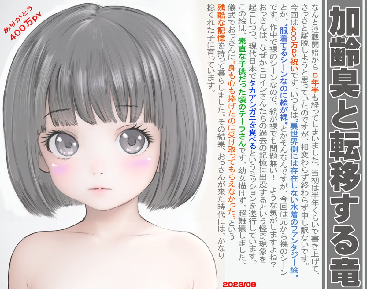 加齢臭と転移する竜 ncode.syosetu.com/n8898ej/945/ PCいじったり絵を描いたり(加工?)で、投稿ペース下がってますが、450万文字超えました(予約含めて?)。 そして、20世紀に描かれた絵が、また再利用されます