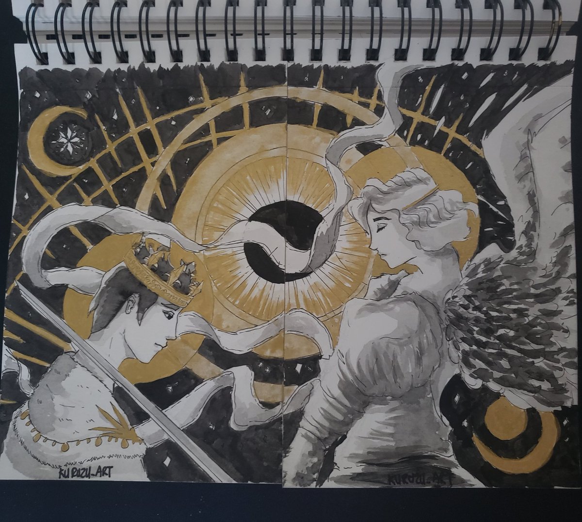 Kuzutober 25 & 26 : The King and the Guardian #inktober #angel #king #blessed sport #light #moon #black #gold #art #ink #artworks #watercolor #paper #inktober2020 #day26 #crown #paper #scroll #guardian #woman #dress #star #space #sky #day25