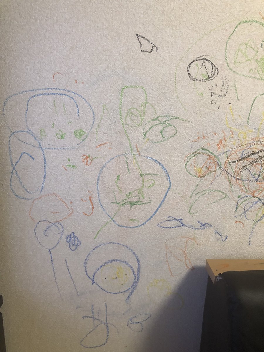 0 8 娘の落書き 丸に点々を毎回描くのは顔のつもりなのだろうか 部屋の壁にも落書き 賃貸って六年住めば壁紙とか耐用年数で引越し時交換タダになったよね… 22/09/27 16:59