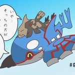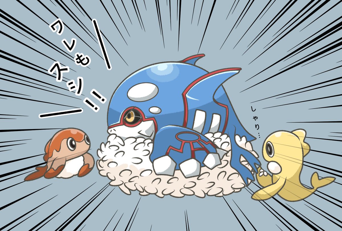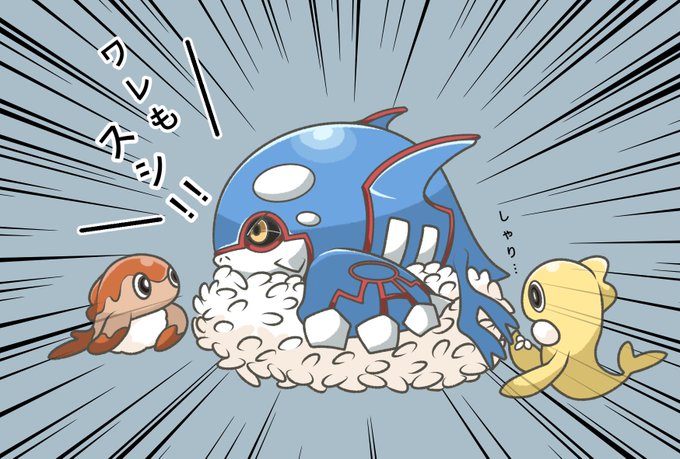 #ポケモンイラスト ワレも…スシ!!>カイオーガ (´・-・`)ジッ…>サーモンシャリタツ シャリ…>卵シャリタツ