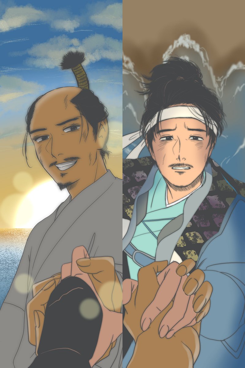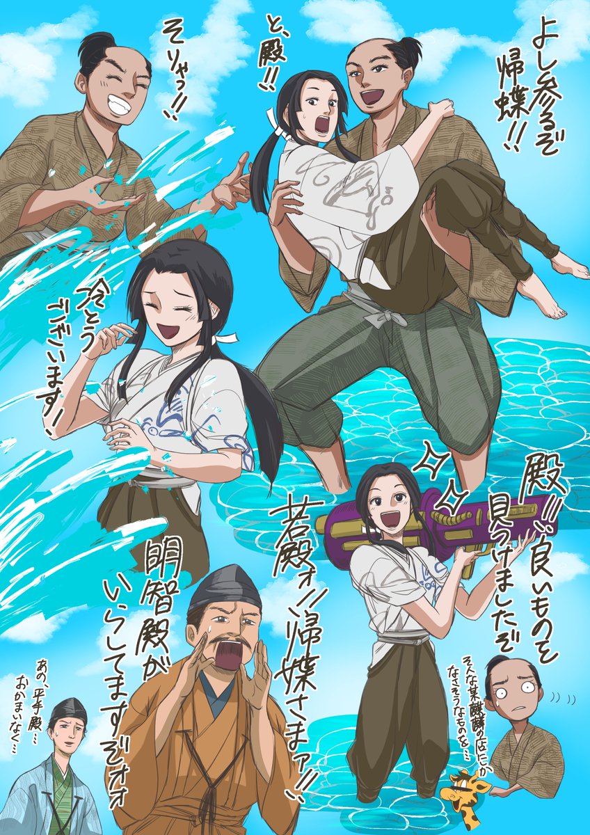 熱田の海を帰蝶に楽しんでもらいたいノッブ。用向きも分からんまま呼ばれた十兵衛はこの後水鉄砲合戦に強制参加させられる…。海の日だったからね。 #麒麟絵