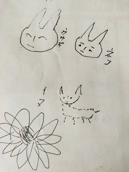 ちなみにこちらは叔母の落書き。ウサギとイヌとネコの違いがよく分からないが癒される。 後はインコとメダカらしい。