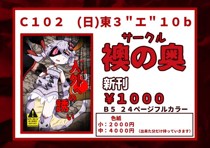 45 72 C102のお品書きになります! 新刊と色紙の頒布になります。色紙は完成した分だけ持って行きます twitter.com/Kyu_kei02/stat… 23/08/10 16:46