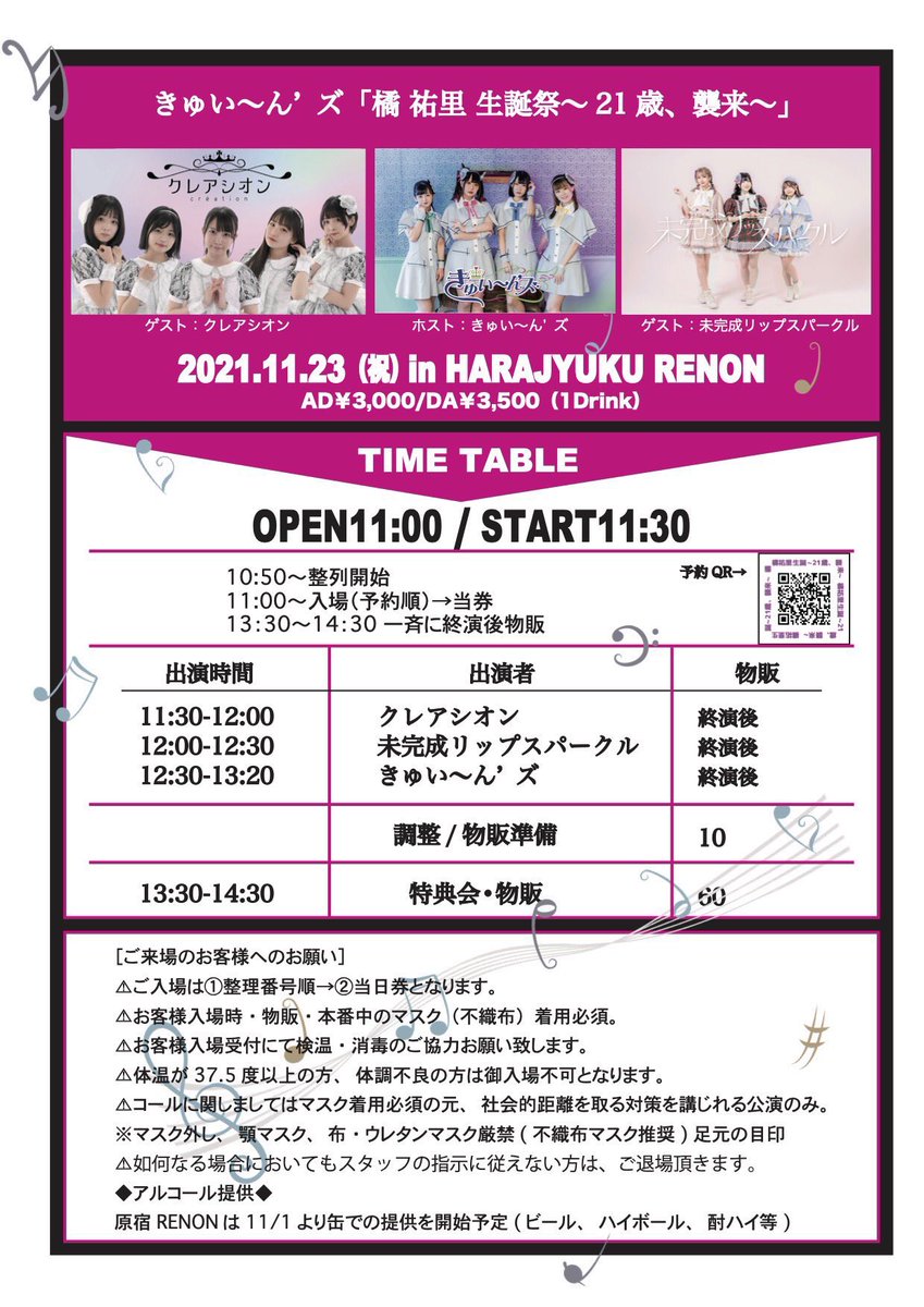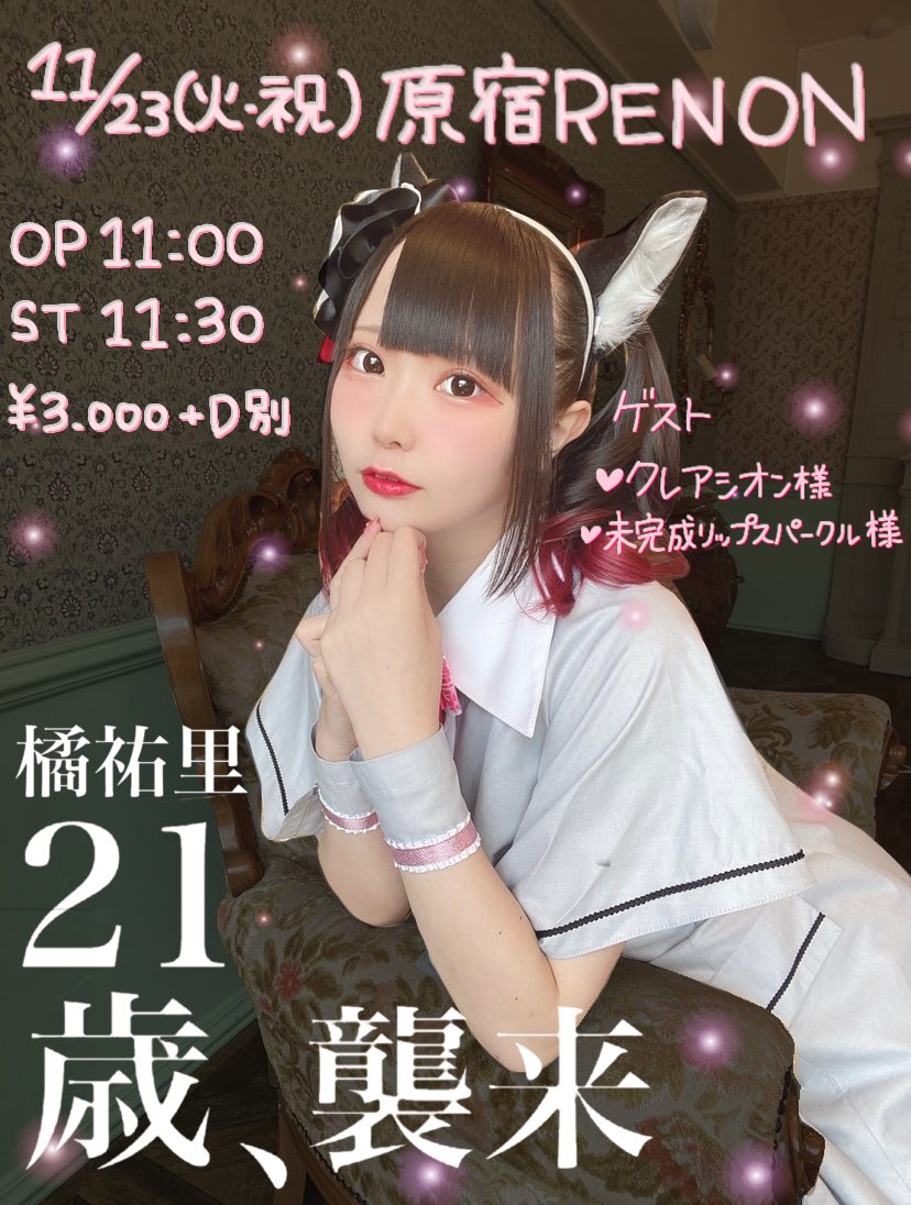 #RT #拡散希望 11/23(火・祝) ✨橘祐里生誕祭~21歳、襲来~✨ 会場→原宿RENON OP11:00/ST11:30 前売り¥3,000+D別 🎫→tiget.net/events/154536 私の生誕祭🎉 ソロ、カバー、〇〇〇あり、、‼️ 沢山の方に来て貰いたいです‼️ チケット販売中✨ ぜひお祝いしてください🥺