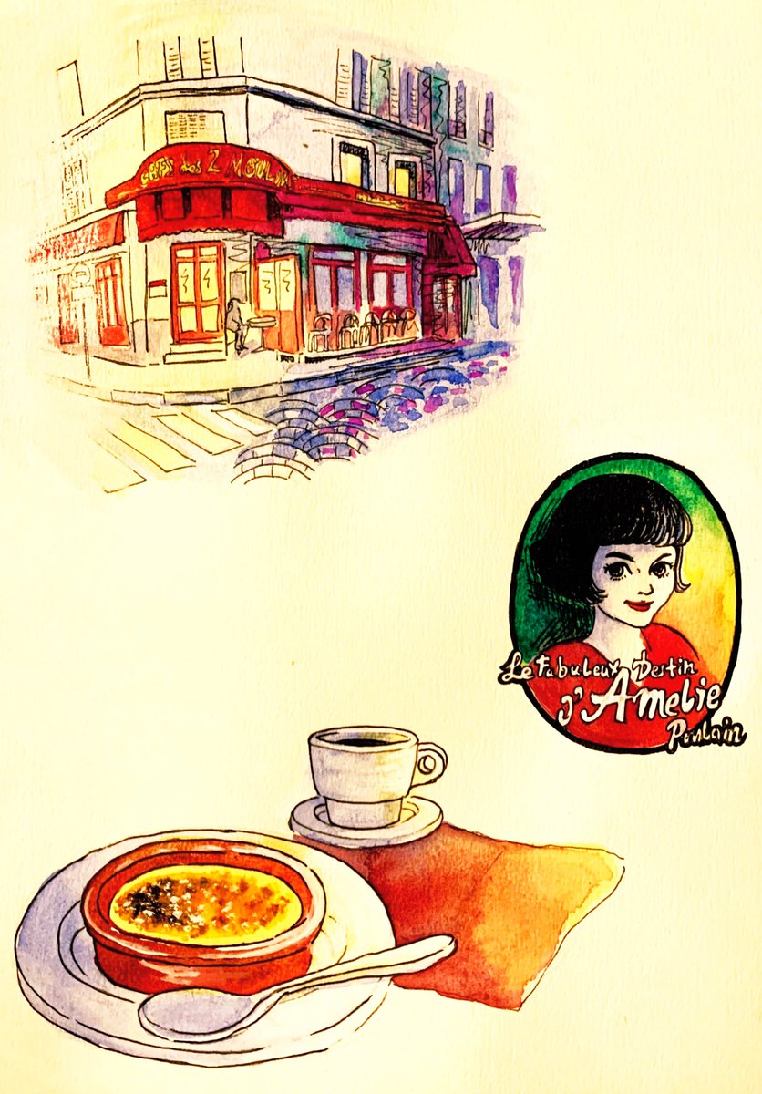 【CAFÉ des 2 Moulins】 ✴︎コラム、エッセイの挿絵✴︎ 映画「アメリ」のロケで使用された フランス、モンマルトルにある 『CAFÉ des 2 Moulins(カフェ・デ・ドゥー・ムーラン)』 #イラスト #フード #アメリ #映画