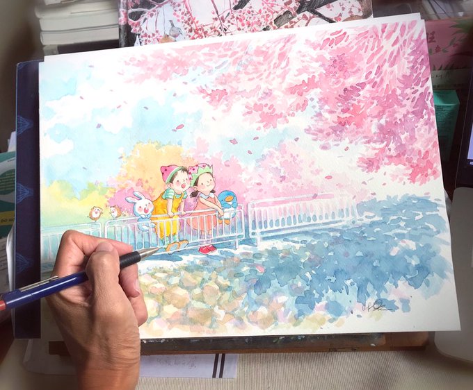 #Illustrator #workingfromhome no.2🤗 Hopefully life could be back to normal soonest.Hopefully we could enjoy spring blossom together next spring✌🏻🤞🏻 #ahguo #Watercolor #illustration #singaporeartist #spring #ArtistOnTwitter #水彩 #插画