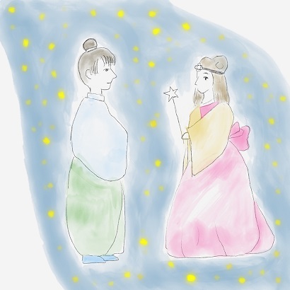 今朝はこちらの動画を参考に「彦星と織姫」。 youtube.com/watch?v=DBiFP0… 織姫が星の杖を持ってて、織姫というより「お告げに来た天使」or「キキララのキキ」みたい?😅 全体的に色が薄過ぎた。 七夕なのに生憎の雨ですね(ってか、毎年そうじゃない?)。 #七夕 #一日一絵 #procreate #デジタルイラスト