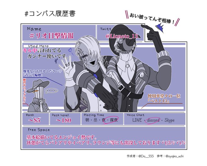 20 144 #コンパス履歴書 #コンパスお絵描き勢と繋がりたい 初履歴書です。 好きなもの描いたりスクショ投げたりしてるゲーム垢です、気になった方お迎えさせて下さい🙏 21/12/25 11:49