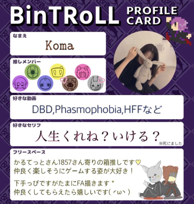 お友達探し🐰🤍 びんとろ民の先輩の皆様ぜひ繋がって下さい( ◜ω◝ )!下手っぴですがお絵描きもするのでたまにFAあげたりします🎨* ♡RTで気になった方お迎えに行かせて頂きます💐 #bintrollFA #bintroll自己紹介カード #bintroll好きさんと繋がりたい