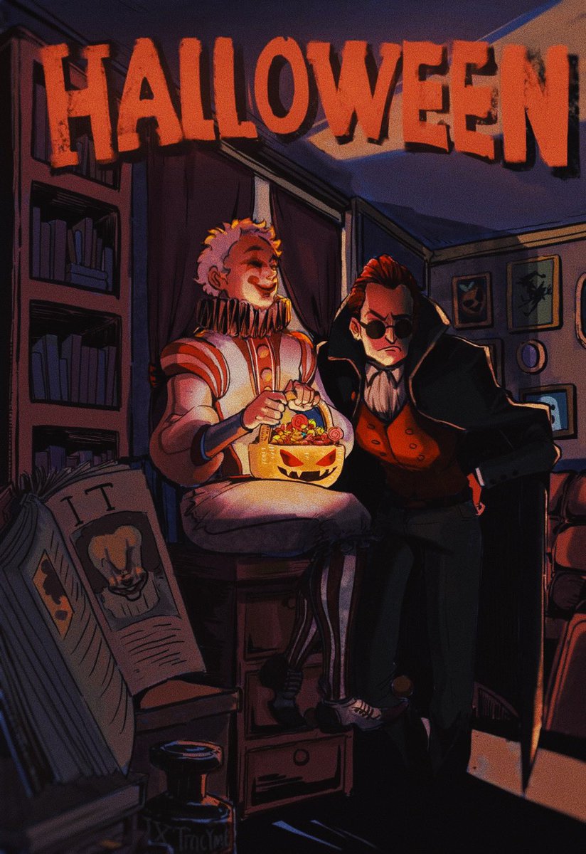 Aziraphale absolutely misunderstood the spooky of a clown…but he’s Aziraphale so Crowley took over the scaring job (unsuccessfully). Just want to say happy Halloween!! #GoodOmens #GoodOmensFanArt