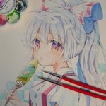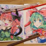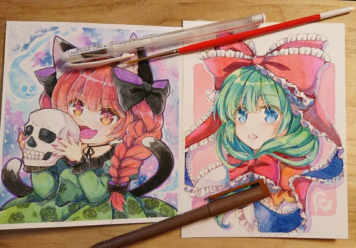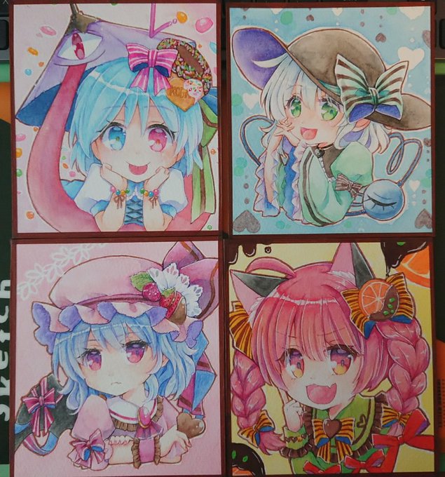 こちら4枚原画色紙が出来上がりました 今週土曜日21時にpixivBoothにて 1枚3000円にて頒布いたします 原画なので一点物です #東方Project #レミリア・スカーレット #古明地こいし #火焔猫燐 #多々良小傘 #アナログ絵