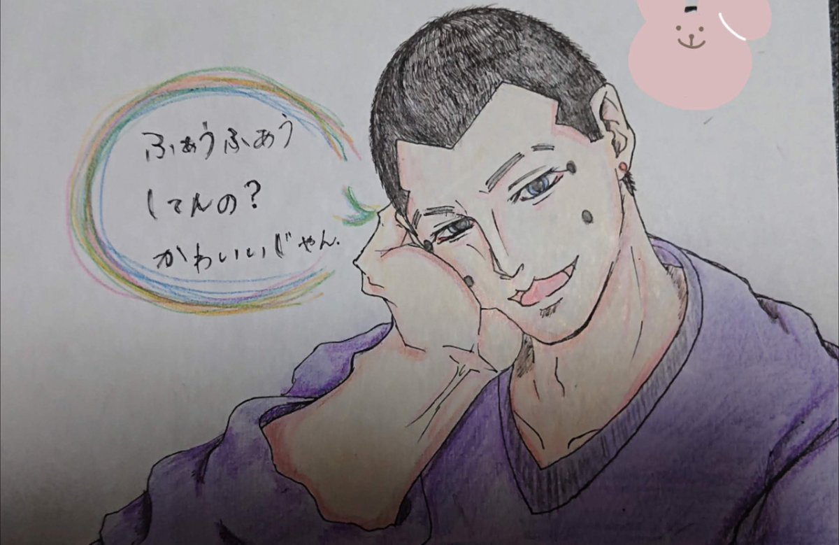 過去作になりますが、この絵は気に入ってます! コピー用紙にシャーペンでかきかきして、余分な線を消して、そのままミリペンで線画。そして線を際立たせるために少し肉付けして、色鉛筆で塗り塗り。時々指やティッシュでぼかす。 それだけ👍❤ #金カムアナログイラスト部