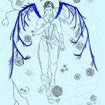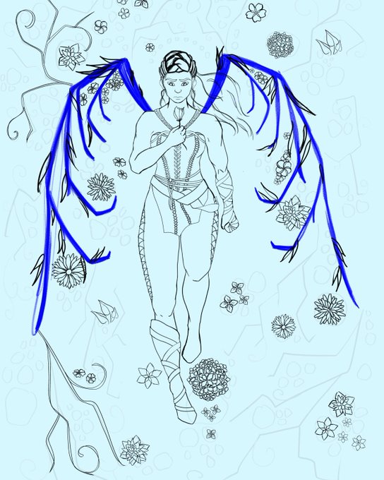 Yasha Nydoorin sketch. She's in a field of flowers ( the blobs), feathers are starting to grow from her wings, there are lightning shaped vines reaching out, a flower for Zuala and a wrist band for Beau. #yashanydoorin #mightynein #criticalrole #criticalrolefanart #wipart