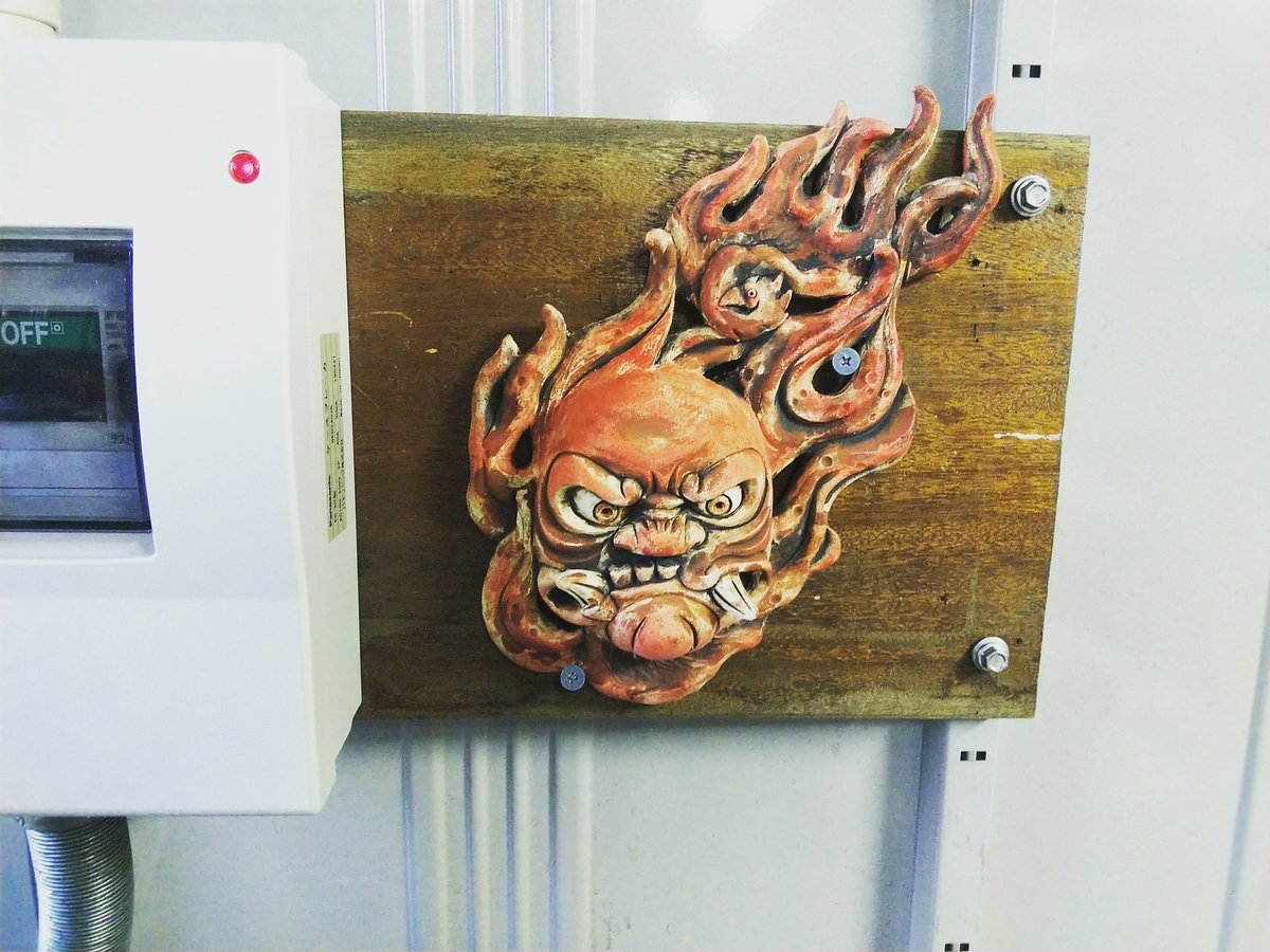 いい感じに焼けましたので火の神として窯の安全と成功を願って電源側に飾る(*´ڡ`●) #インテリア #鬼 #不動明王 #縁起物 #魔除け #陶芸 #ceramics #みんなのクラフトフェア #手跡屋 #辰巳又助