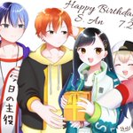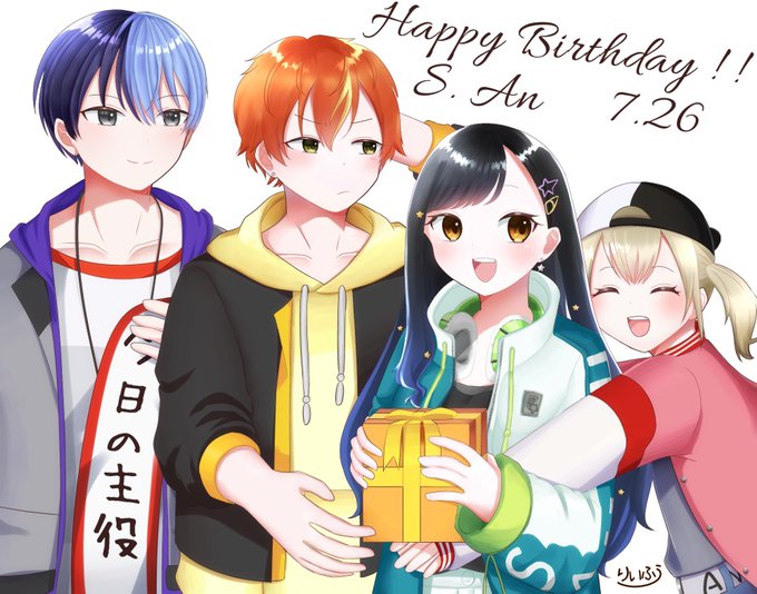 お誕生日おめでとうー!! 杏ちゃんも杏ちゃんの歌も大好きだー! 抱きつく係のこはねちゃんとプレゼント渡す係の彰人とタスキ渡す係の冬弥でお祝い!!ほんとにおめでとうー!大好きだー!! #prsk_FA #白石杏誕生祭2021 #白石杏生誕祭2021