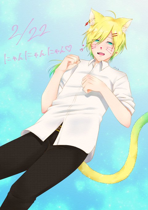 猫の日なのでおにいたん(イリスくん)の猫耳姿をお納めください( ///◜p◝/// ) #絵描きさんと繫がりたい #創作 #猫の日 #私の絵柄が好みって人にフォローされたい #RTで私を有名にして下さい