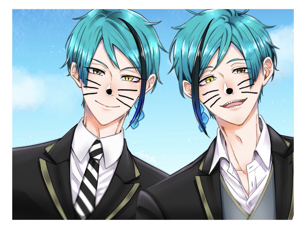 監督生に「先輩方、写真いいですか?」って聞かれたので 🦈「いいよォ」🐬「いいですよ」 って言ったばかりに某カメラアプリで遊ばれるけど顔がいいから何でも似合うリーチ兄弟 (そして普通の写真も撮った) #ツイステファンアート #twstプラス #ツイステッドワンダーランド