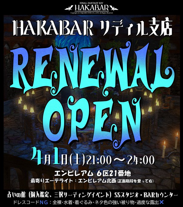 🔯HAKABARリディル支店「占いの館」オープン記念営業🔯 ・4/1(土) 21時~24時 ・GaiaDC Ridill エンピレアム6区21番 撮影スタジオや雰囲気はそのままに、店主によるタロット占いをお楽しみいただけます 皆様のご来店を楽しみにお待ちしておりますぞ!⚰️👍 #HAKABAR_占いの館 #HAKABAR_FF14