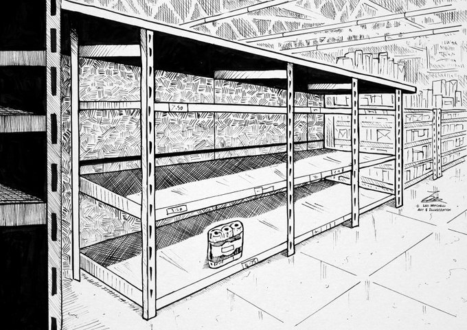 Inktober 2022 no.14 - “Empty” 🧻 Based on an actual photo I took in 2020 during the you-know-what. It was one thing to see this over in the States or the big cities, like London. ‘You never expect it from your local Asda. #inktober #inktober2022 #InktoberEmpty #inktoberday14