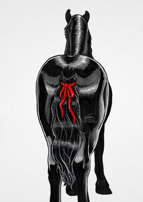 Inktober 2022 no.19 - “Ponytail” 🐎 Growing-up an Equestrian, I knew a red ribbon on the tail means “Stay away, I kick”. But it’s still a mystery as to how you get the ribbon on in the first place. #inktober #inktober2022 #ink #inktoberday19 #inkdrawing #artistsontwitter