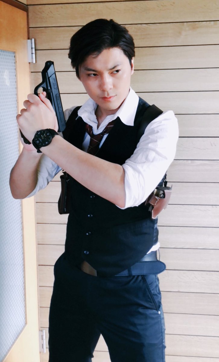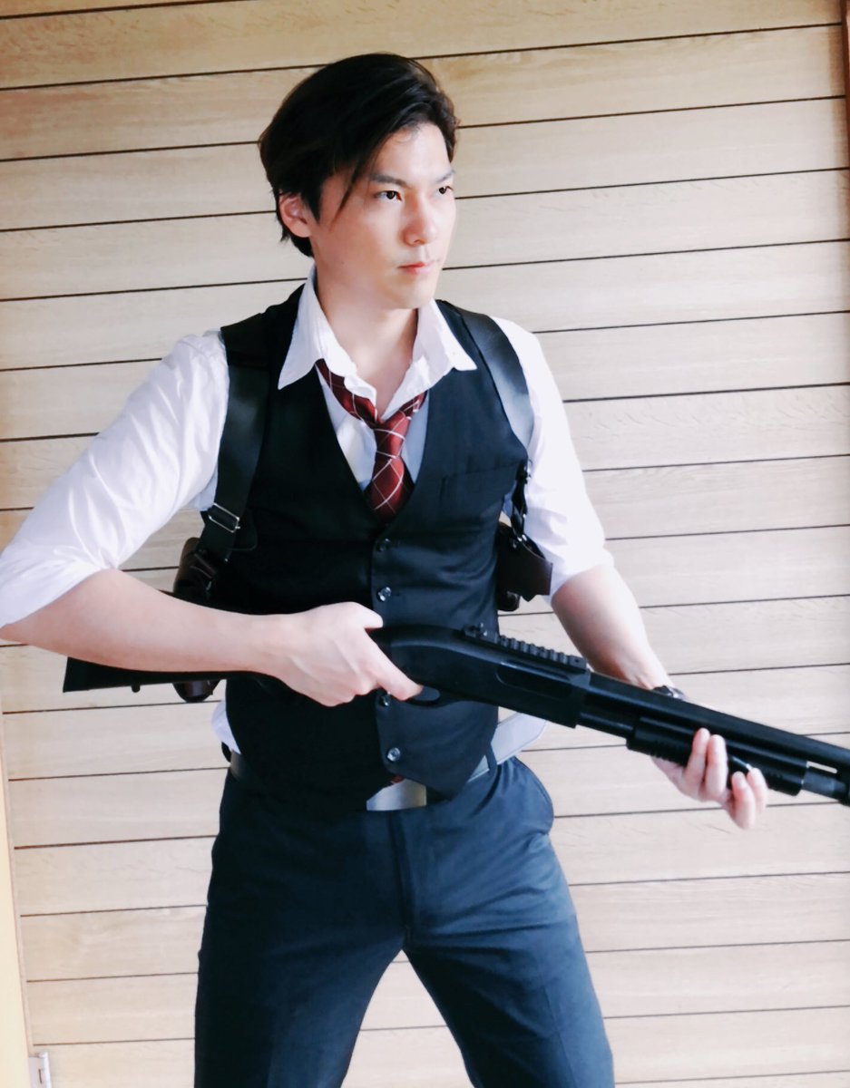 ショルダーホルスターも自作で、ベストもコスプレの奴を改造して作ってあります!