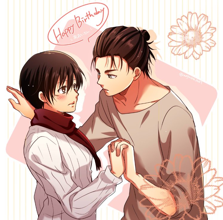 【 Cosplay 】 エレンお誕生日おめでとう!!!!! お花が似合うねぇエレンんん!! 1人でエレミカした🤦♀️ 顔面事故ってるけど、優しい雰囲気は作れたはず。私は2人に笑って欲しいんだ。 #エレン・イェーガー生誕祭2022 #エレン生誕祭2022