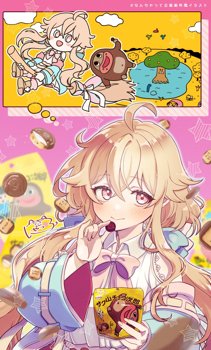 なんちゃって企業案件風イラストの第3弾!魔法使いVTuberの花葉こむぎ様(@878komugi)花葉こむぎ様×サク山チョコ次郎様🍫のイラストになります。ビスケットとミルクチョコの間にクリームが挟まっているチョコレートのお菓子。ポイポイ食べれちゃう美味しさなのです!#なんちゃって企業案件風イラスト