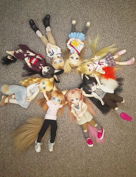 #今夜のドール撮影120分一本勝負 【ねころがる】 これ、お姉ちゃん達でやったら、不謹慎な絵になった💦🦊🐱🐶💕