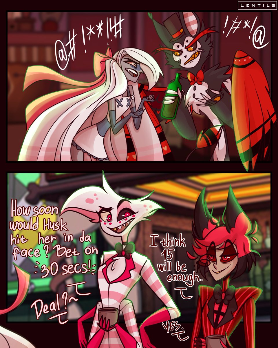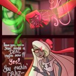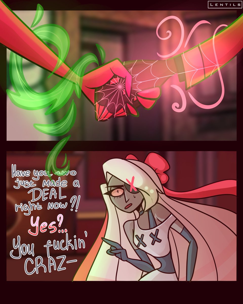 Last #Hunicast (Sorry, i mean #Alastorcast) was so long that I drew a lil comic about a wonderful friendship. [Deal] #HazbinHotelFanart #HazbinHotel #Hazbin_Hotel #Angel_Dust #AngelDust #Alastor #Vaggie #Husk #art #Digitalart #Comic #artistsontwitter