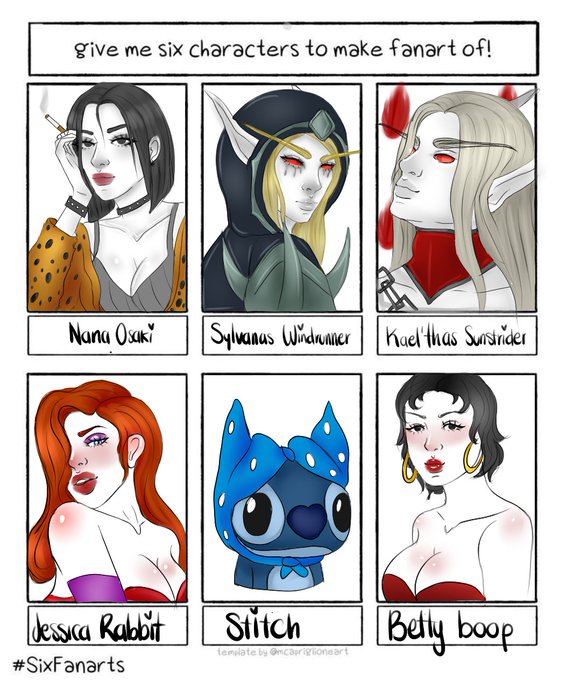 I did not want to let more time pass here are my #Sixfanarts I remind you that my Raffle is still active! I hope like my #SFS #worldofwarcraft #kaelthas #shadowlands #sylvanas #Nanaosaki #Bettyboop #JessicaRabbit #Stitch #Fanart #digitalart #Nanaanime