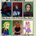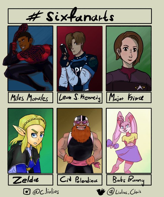Finally, and after giving up twice, I finished #SixFanartsChallenge . And I'm not even lateohnevermind #MilesMorales #spiderman, #LeonSKennedy #ResidentEvil, #MajorKira #StarTrek, #Zelda #botw2, #CidPolendina #FinalFantasy, #BabsBunny #SixFanarts