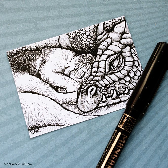 Day 12 of #inktober 🖋 "Dragon" - She purred loudly. She felt safe as the scaly beast watched over her as she slept. 🐉🐈 #inktober2019 #inktoberday12 #illustration #cats #catart #drawing