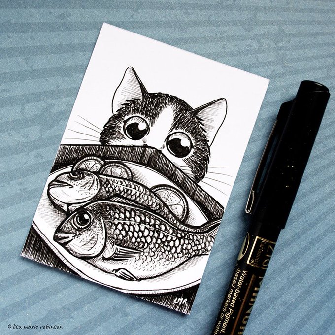 Day 25 of #inktober 🖋 "Tasty" - To a #cat , there's nothing more delicious than a couple of freshly baked fishies! 🐟😻 #inktober2019 #inktoberday25 #drawing #illustration #art #aceo