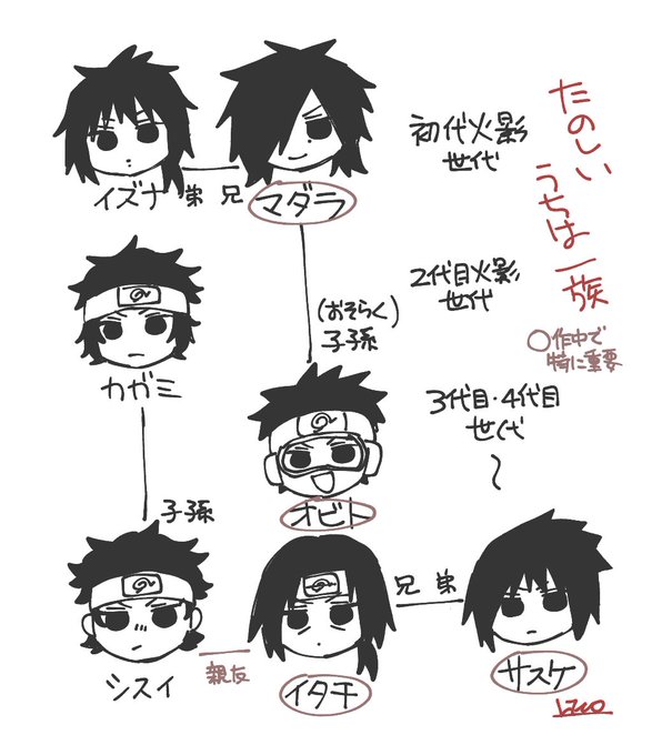 ふぉろわ〜〜がうちは一族の見取り図的なもの欲しい的なこと言ってたから 主要っぽいひとたちを雑にまとめてみたよ