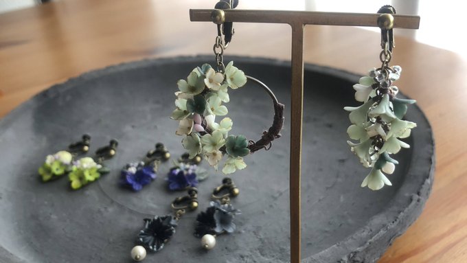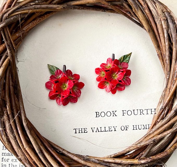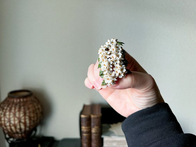 #拘りすぎて楽しくなっちゃった作品を紹介しよう リンゴ作ろうと思って最初は丸いリンゴを作ってたのに… いつの間にか花ひとつずつがリンゴで…集まってもリンゴで… で、出来上がったブローチ 【花果実 花林檎ブローチ】 ですかね🍎🍎🍎 リンゴの斑点も描きました🎨 粘土なので食べられません🙅♀️