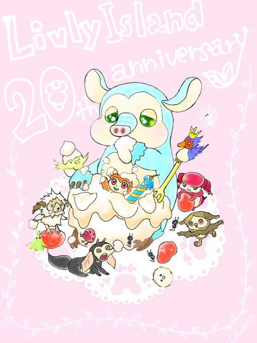 🎊🎉リヴリー20周年おめでとう🎈🎊 クラシック時代に一緒に暮らした仲間とヤミショップの甘〜い⁇ケーキを頬張っていたら…立役者のピグミーがケーキの中からまさかのサプライズ大登場🎉 クリームまみれで皆大盛り上がり❣️さすがはピグミー😂🎂💓 #リヴリー20周年 #リヴリーファンアート #ありがとう
