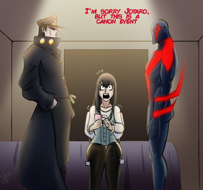"Jotaro, don't look..." Saki said as Miguel held up the crusader. The Jotaro ending isn't canon. #Spiderman2099 #MiguelOHara #jojo #JotaroKujo #metamorphosis #fanart