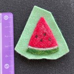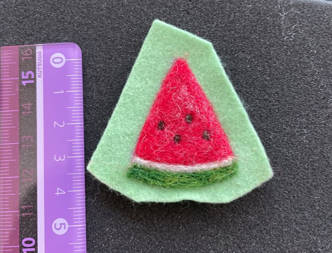 できた〜!カットスイカ😉 まだこれからフェルト切ったりブローチピンつけたりしなきゃいけないけど! 夏の間に夏っぽいもの作りたいなあと思っていたので非常にまんぞく。 わたしにしてはだいぶいい出来🍉 #羊毛フェルト