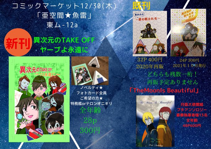 冬コミにてスペース頂けました❗️😭 「亜空間魚雷」はコミックマーケット99で「30日木曜日東地区 "ム" 12a」に配置されました❣️ 頒布内容は変更予定です🙏💦 チーム特務艦で行きます🌀❣️ 次元ターンブロぉ〜L( ´∀`) #C99WebCatalog