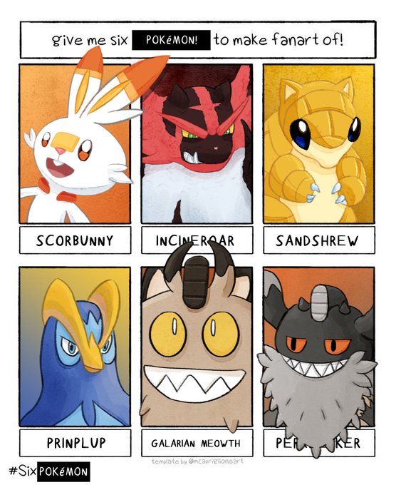 1 5 I drew #SixFanarts but made it #SixPokemon! Scorbunny, Incineroar, Sandshrew, Prinplup, Galarian Meowth, and Perrserker Thanks for the suggestions I used from @gavgreco, @Stringerplz, @LucasElliottArt, and @harris_bryce #SixFanartsChallenge 20/04/20 06:01