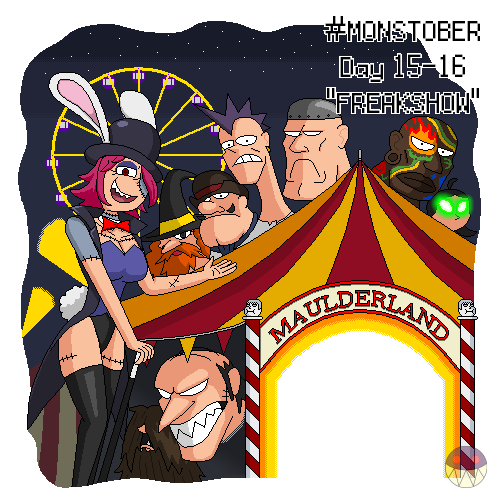 New entry for @BeastSoulArt's #monstober2021. Days 15 and 16's theme: "Freakshow" (with the bearded witch, the twins, the strongman, the tattoed man, the esper, the dog-faced man and the sharkman). #monstober|#inktober2021|#inktober