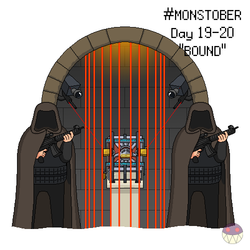 New entry for @BeastSoulArt's #monstober2021. Days 19 and 20's theme: "Bound" (Those monks have orders to shoot to kill anyone who comes near that book). #monstober|#inktober2021|#inktober