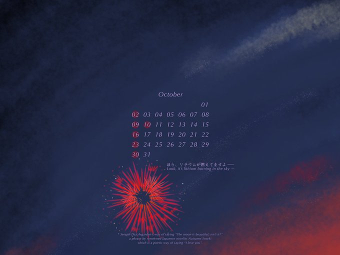 セラおの名(迷)言で10月のカレンダー 名言ありと名言なしver 「ぐぅの音も出ない…ぐぅ」で作る予定だったけど、滑り込みで炎色反応大観測大会が自分の中で勝った ロック画面の壁紙用等にどうぞ(大きめに作ったので、端末に合わせてトリミングしてください) リプに英文の説明と使用例↓ #SeraPic