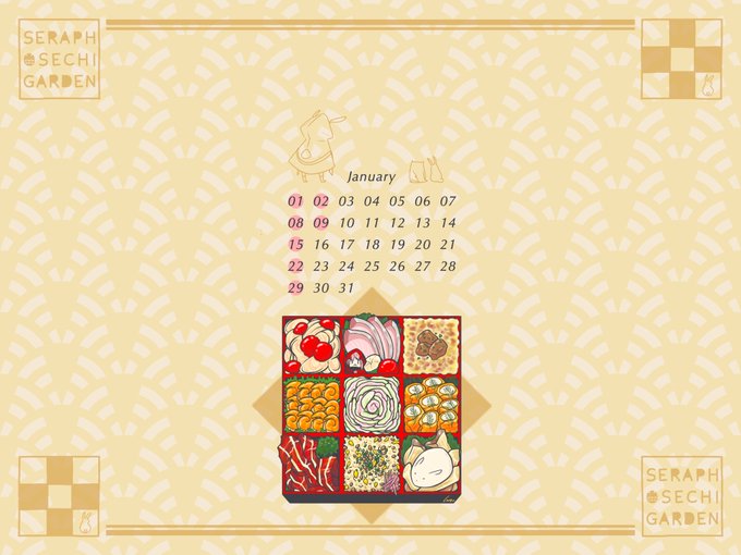 1 9 明けましたおめでとうございました ミミズク(木兎)も実質うさぎなので(?)セラおもセラズクも躍進の機会に恵まれる年になるでしょう 2023年1月のカレンダーですが、セラおの配信で登場した食べ物を僭越ながら厳選し、おせちのイラストにしました 端末に合わせてトリミングしてご使用ください #SeraPic 23/01/09 02:28