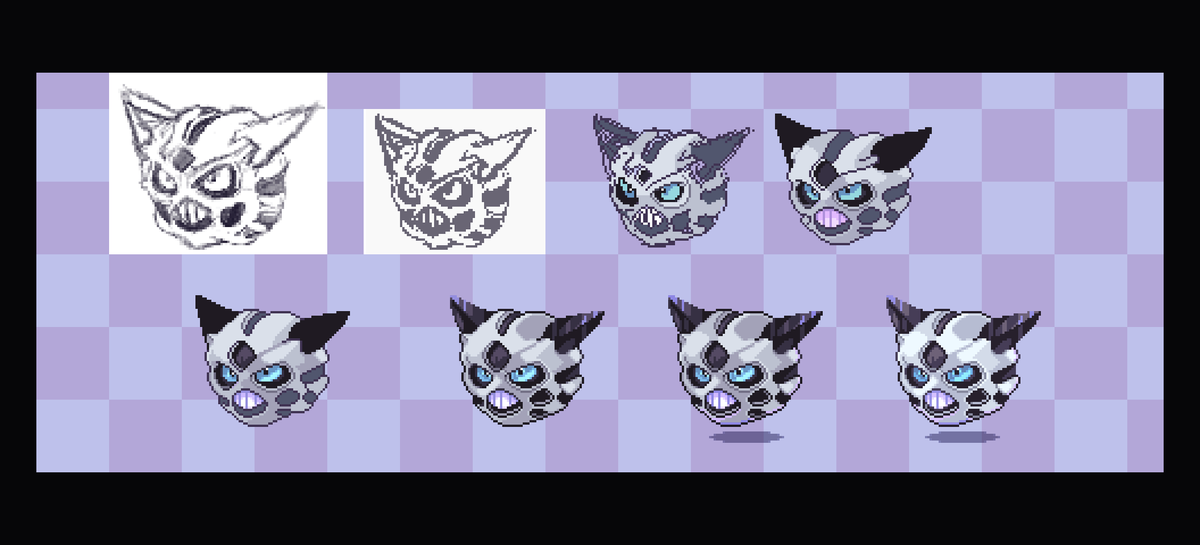 【作品】 精靈寶可夢 冰鬼護的作畫過程 紙上草稿>像素化>訂出色塊部位>上基本陰影> 修細>加上反光>影子與環境光>調整色彩曲線後完稿! | #ポケモン #オニゴーリ |#pixelart #ドット絵